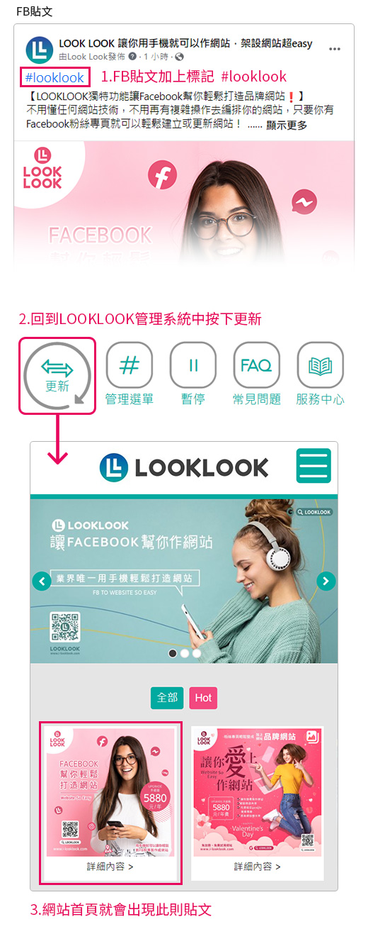 #標記要如何使用?LOOKLOOK系統除了可以讓你的Facebook粉絲專頁瞬間變網站之外,我們系統更可以讓你自由選取想要被獲取到網站的貼文,只要你在facebook粉絲專頁中你發布的貼文中輸入標記#looklook,再回到LOOKLOOK系統中按下更新,那一則被標記的貼文就會被獲取進你網站的首頁之中。