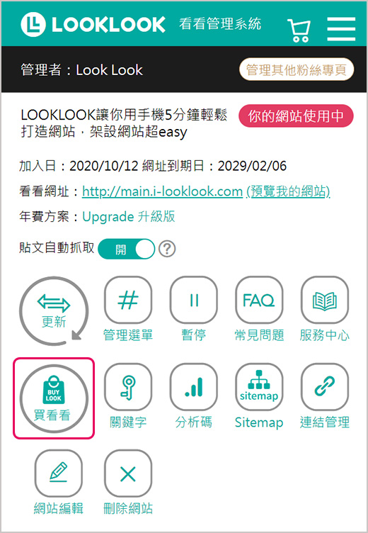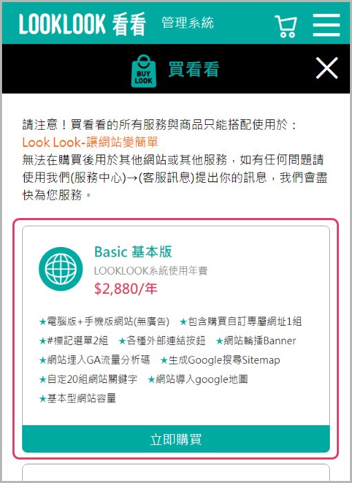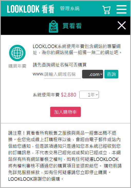 2.點擊購買LOOKLOOK系統使用年費,年費包含「1組自定的專屬網址」