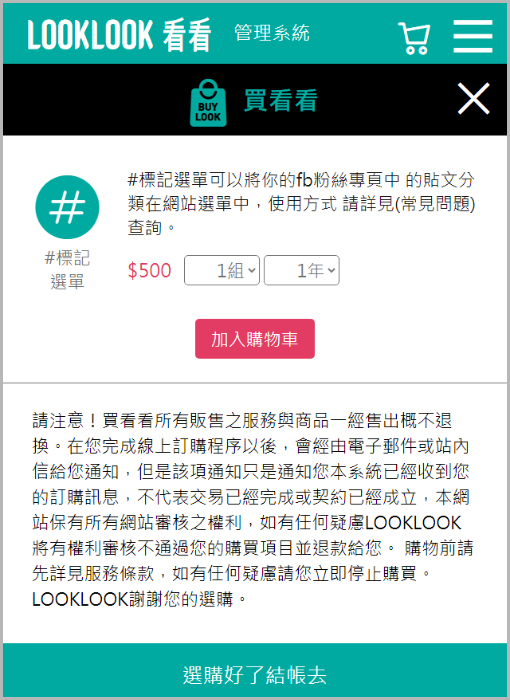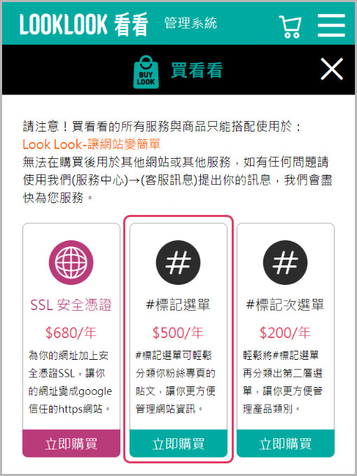 #標記選單不夠用!可以增加購買嗎?可以的,#標記選單簡單好用,所以您可能會遇到不夠使用的問題,你可以在LOOKLOOK系統中直接購買