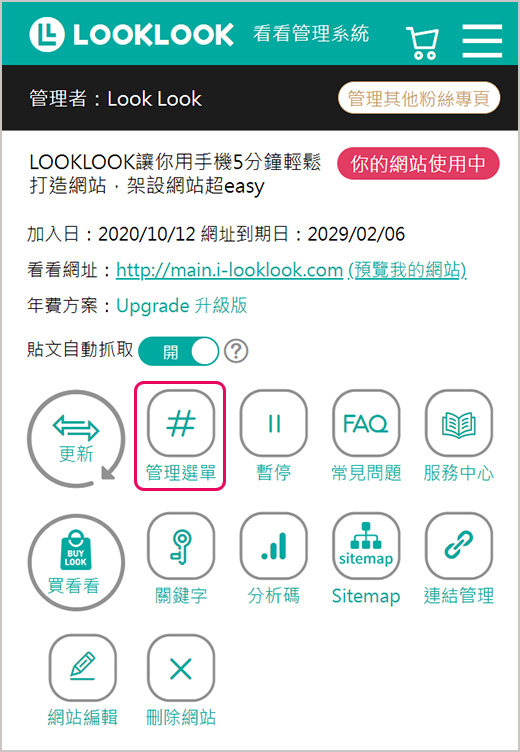 1.在LOOKLOOK管理系統中點擊#管理選單按鈕