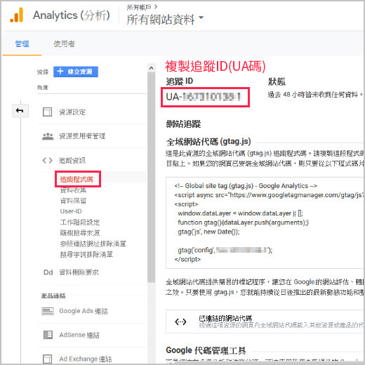 5.建立完成後就可以複製你的追蹤ID(UA碼)