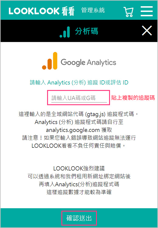 6.回到LOOKLOOK的分析碼,貼上你複製的追蹤ID(UA碼)後確認送出