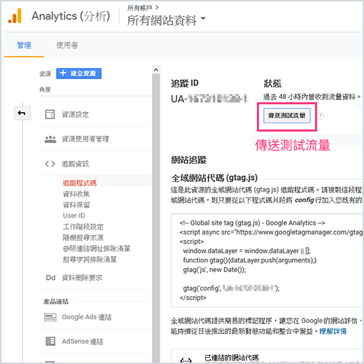 8.回到Google Analytics分析,按下「傳送測試流量」就可以完成第一次你的網站追蹤碼認證。