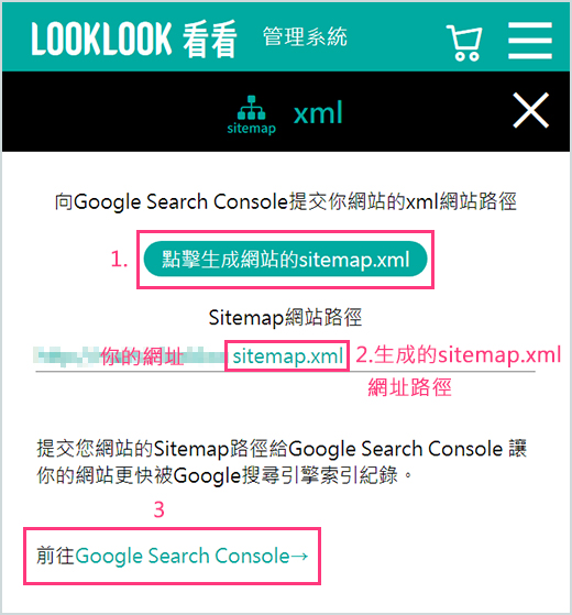 4.選擇Sitemap選項後貼上LOOKLOOK幫您網站生成的