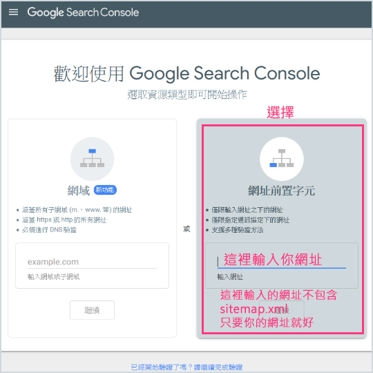 2.來到Google Search Console後請選擇「網址前置字元」的驗證方式