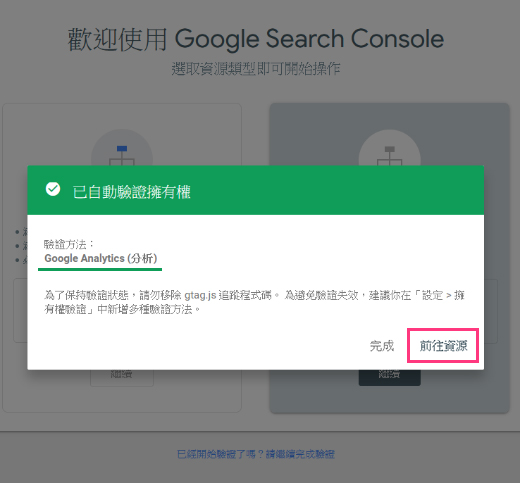 3.因為你已經完成Google Analytics追蹤ID驗證程序,所以這裡就會自動完成網址驗證。
