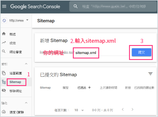 Sitemap.xml路徑如何提交給Google Search Console?請注意!Sitemap提交前請一定要先完成Google Analytics追蹤UA碼或G碼輸入完成的程序(步驟一)