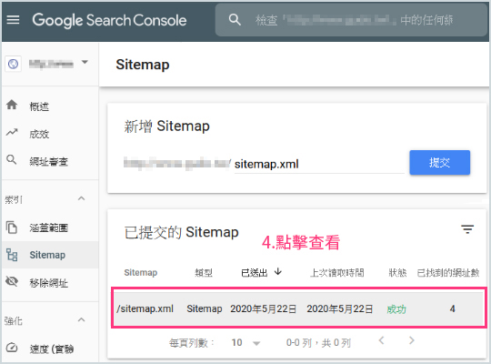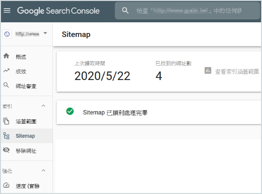 6.你會看到Google搜尋引擎檢查網站後找到您網站的頁面數,並順利處理完畢