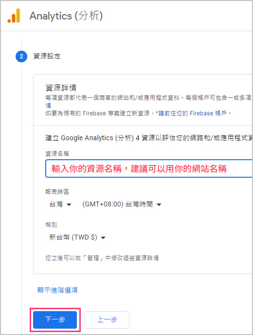 3.「資源設定」建議可以輸入你的網站名稱
