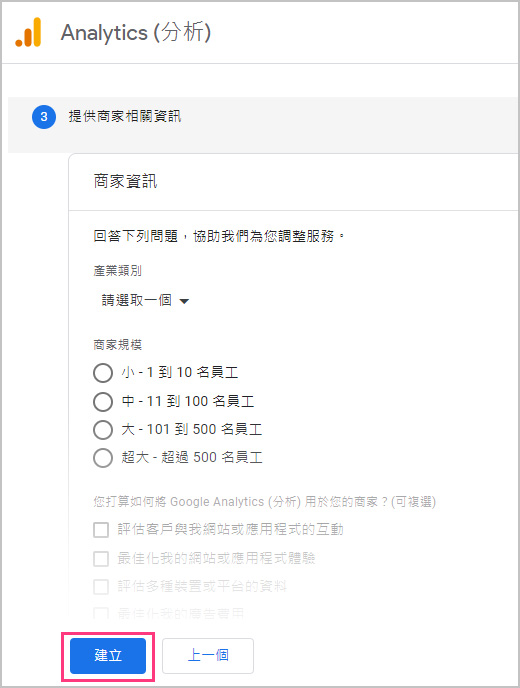 4.「商家資訊」這是google收集您的商家資訊,您可以先不提供,之後再填就可以,直接按下建立