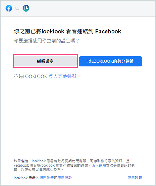 4.點擊「編輯設定」選取你想搭配LOOKLOOK系統獲取公開資料的Facebook粉絲專頁