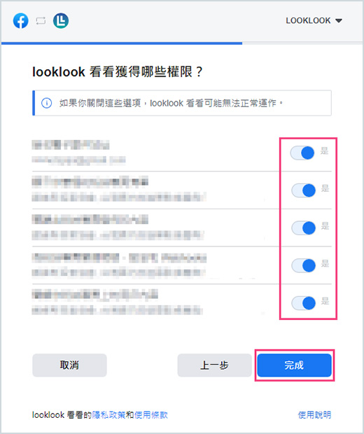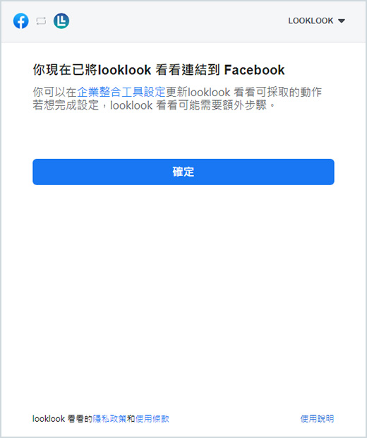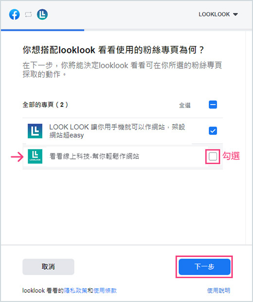5.同意權限授予LOOKLOOK,讓系統可以幫你獲取你的粉絲專頁公開資訊