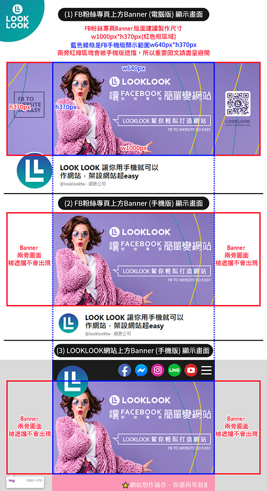 我們建議製作的封面Banner尺寸是稍微再做大一點,寬1000px*高370px(或是這個比例往上解析製作)。而重要圖文請置中放在寬640px*高370px之中,這樣就可以避免在FB手機版時圖片兩旁被遮擋住!而這樣的Banner在LOOKLOOK導入到網站後也能得到最佳的顯示效果,現在就試看看吧!