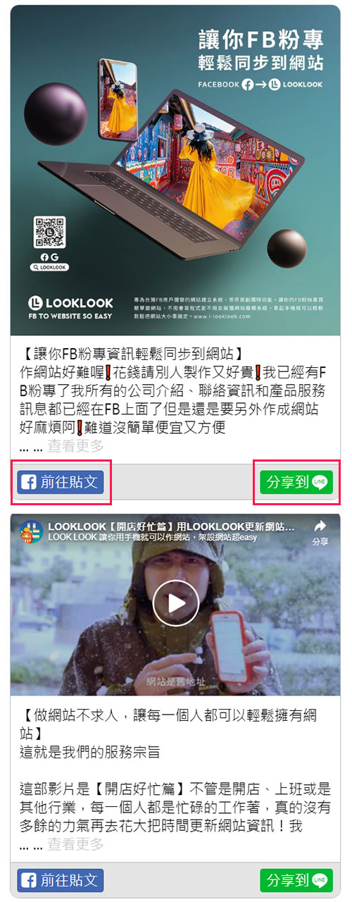 而且LOOKLOOK將貼文導入網站後還會自動在每一篇貼文加上"前往貼文"和"分享到LINE"按鈕,讓每一個瀏覽者可以方便LINE分享或是前往此篇FB貼文。更可以讓網站管理者可以輕鬆找到每一篇貼文的連結就可以方便的分享給客戶。