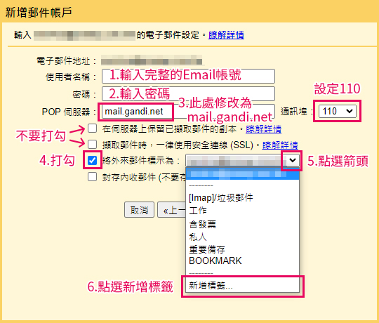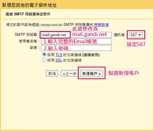 7.回到原視窗依照圖上說明設定,最後點選新增帳戶