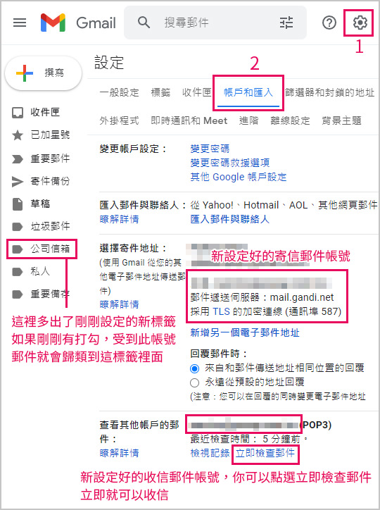 8.這樣就完成了此帳號在Gmail中收信的設定了