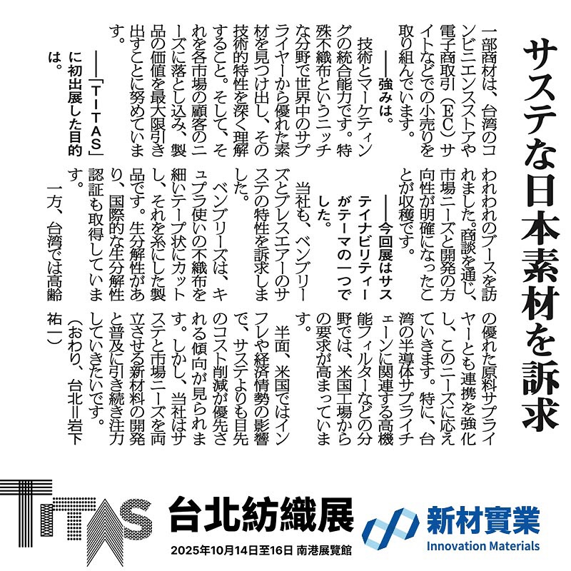 「新材」という社名の通り、当社は最新素材を繊維業界に提案したいという思いがあります。今回は、旭化成のキュプラ長繊維不織布「ベンリーゼ」を使ったペーパーヤーン「ベンブリーズ」と、東洋紡エムシーの3層構造型網状繊維構造体「ブレスエアー」を使ったマットレスを広く知っていただく絶好の機会と捉えました。